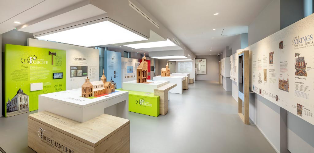 La scénographie propose ici un accompagnement complice discret et exigeant qui décline une série d’espaces variés. Chacun propose une contextualisation en lien avec les contenus qui y sont développés : La tour, le cloître, le scriptorium, le cabinet d’architecte...