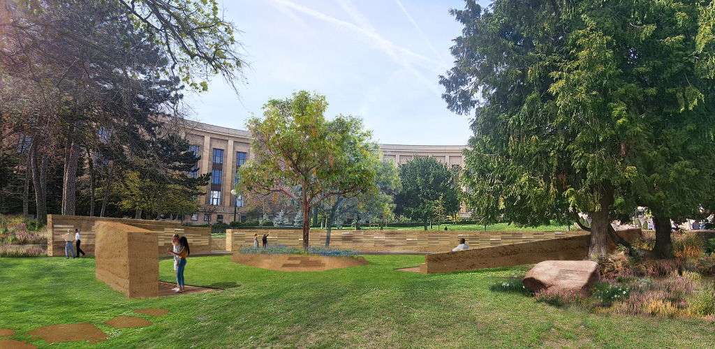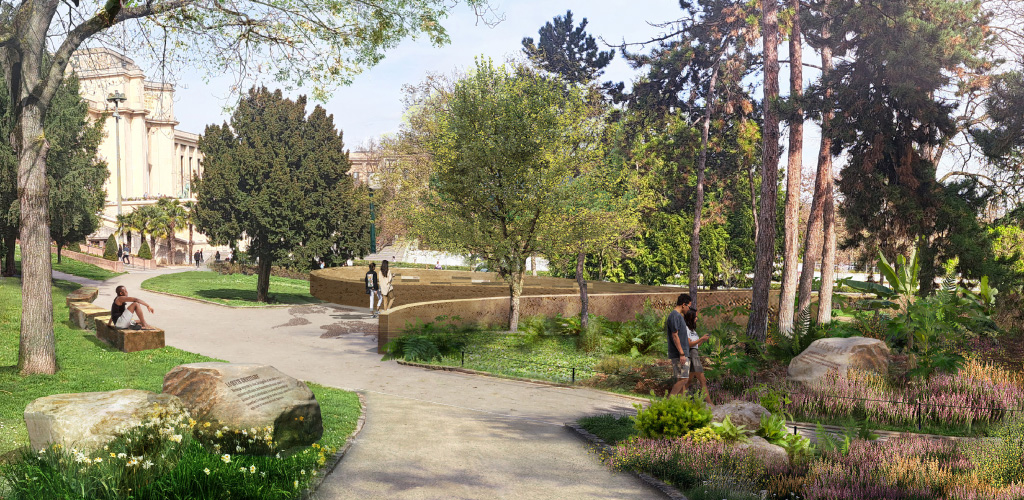 Notre proposition suggère d’agréger l’Histoire à la trame paysagère du jardin, qui en devient le support et l’écrin. Les arbres, les roches, la terre, le sol, le rapport au ciel : l’environnement tout entier devient le socle d’une narration qui évoque et incarne le souffle et la présence des victimes autour d’un parcours jalonné de dispositifs de médiation égrainés dans la végétation. Le mur des noms, cœur battant du mémorial, se pose naturellement sur la topographie des lieux, en déclivité douce vers la Seine.